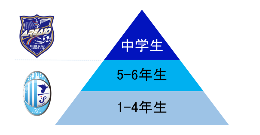 小学生年代(SPROJECT F.C.)からAREA10のジュニアユース年代(U-15)まで、統一コンセプトのもと段階的に選手を育成するシステムを採用します。SPROJECT FCの基本戦術を継続し、選手の発育・発達に応じた技術、戦術、人間性を継続的に指導して選手を育てます。